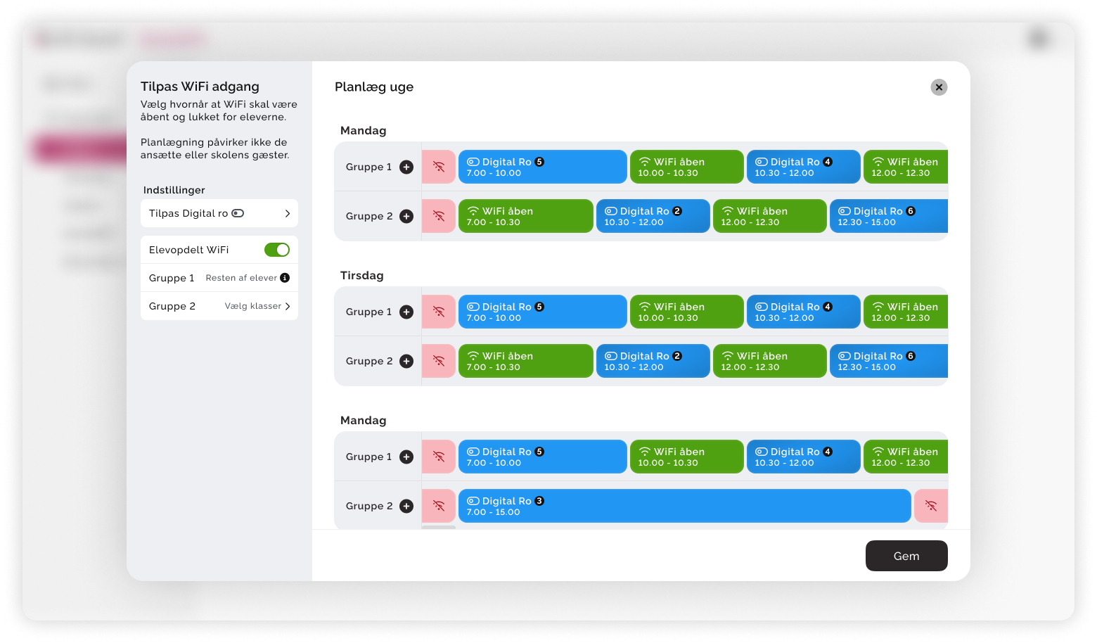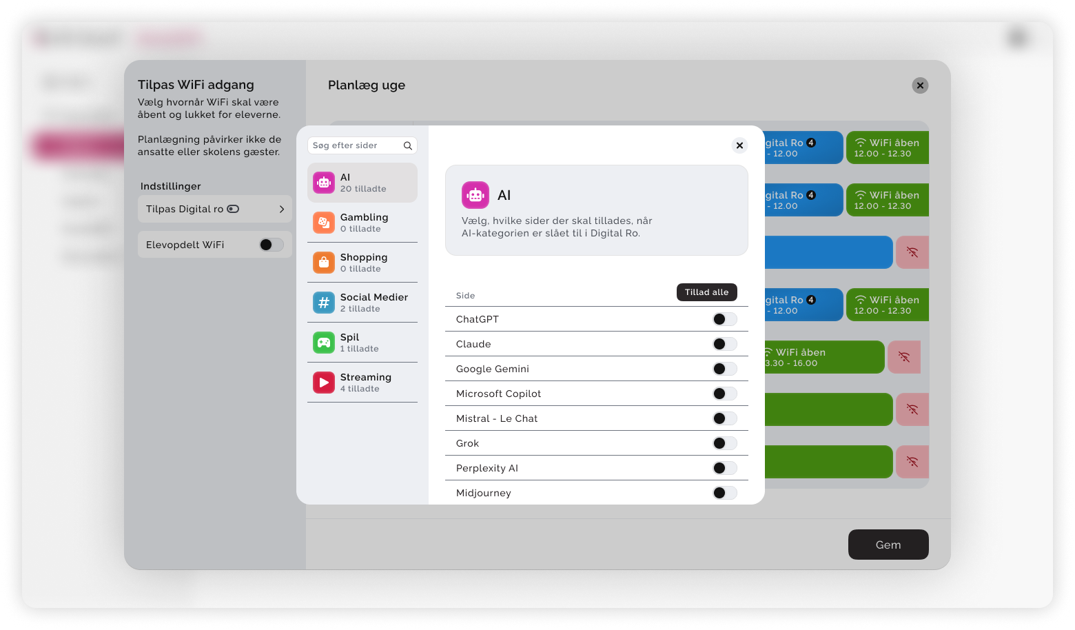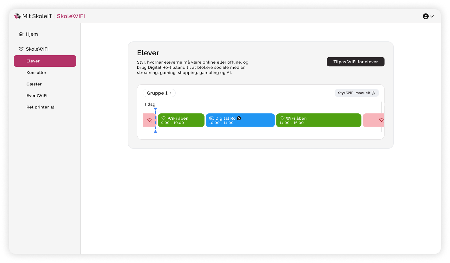 Før folketingsvalget stod et bredt politisk flertal bag et lovforslag om filtrering af digitale forstyrrelser på grundskolernes netværk. Formålet er at begrænse indhold uden faglig og pædagogisk relevans. Med SkoleWiFi kan I med få klik selv styre elevernes adgang til sociale medier, shopping, streaming, gaming, gambling og AI direkte på skolens netværk.