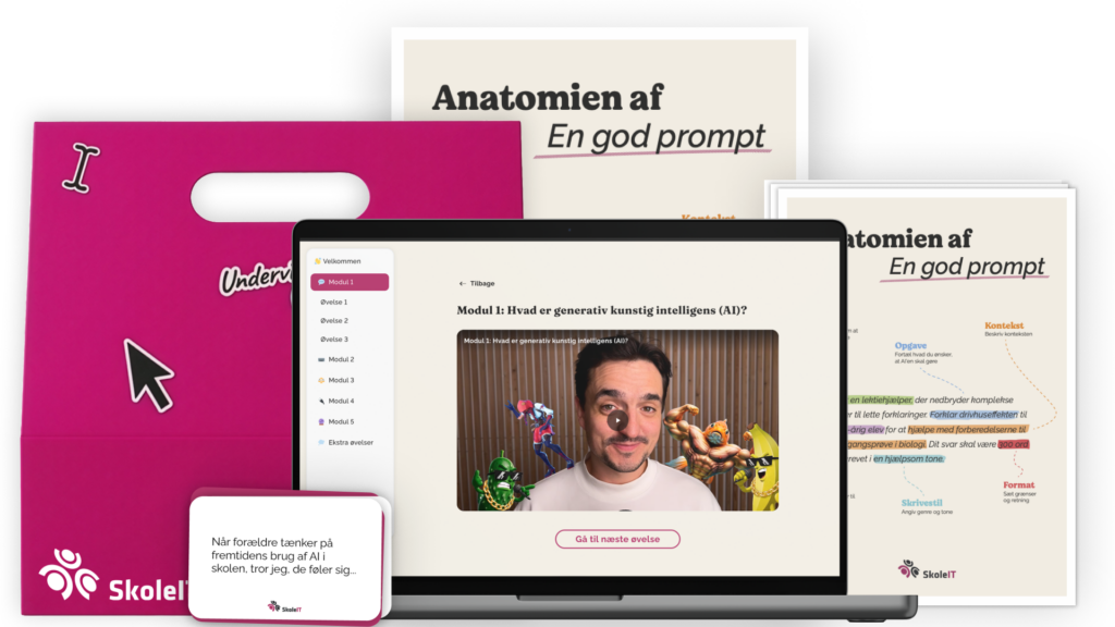 Forløbet ‘AI i skolen‘ består af fem moduler, der kombinerer videooplæg, klassesnakke, gruppeaktiviteter og digitale øvelser. Eleverne får en grundlæggende viden og gør sig deres egne erfaringer med AI, så de bliver nysgerrige, kritiske og bevidste digitale brugere.